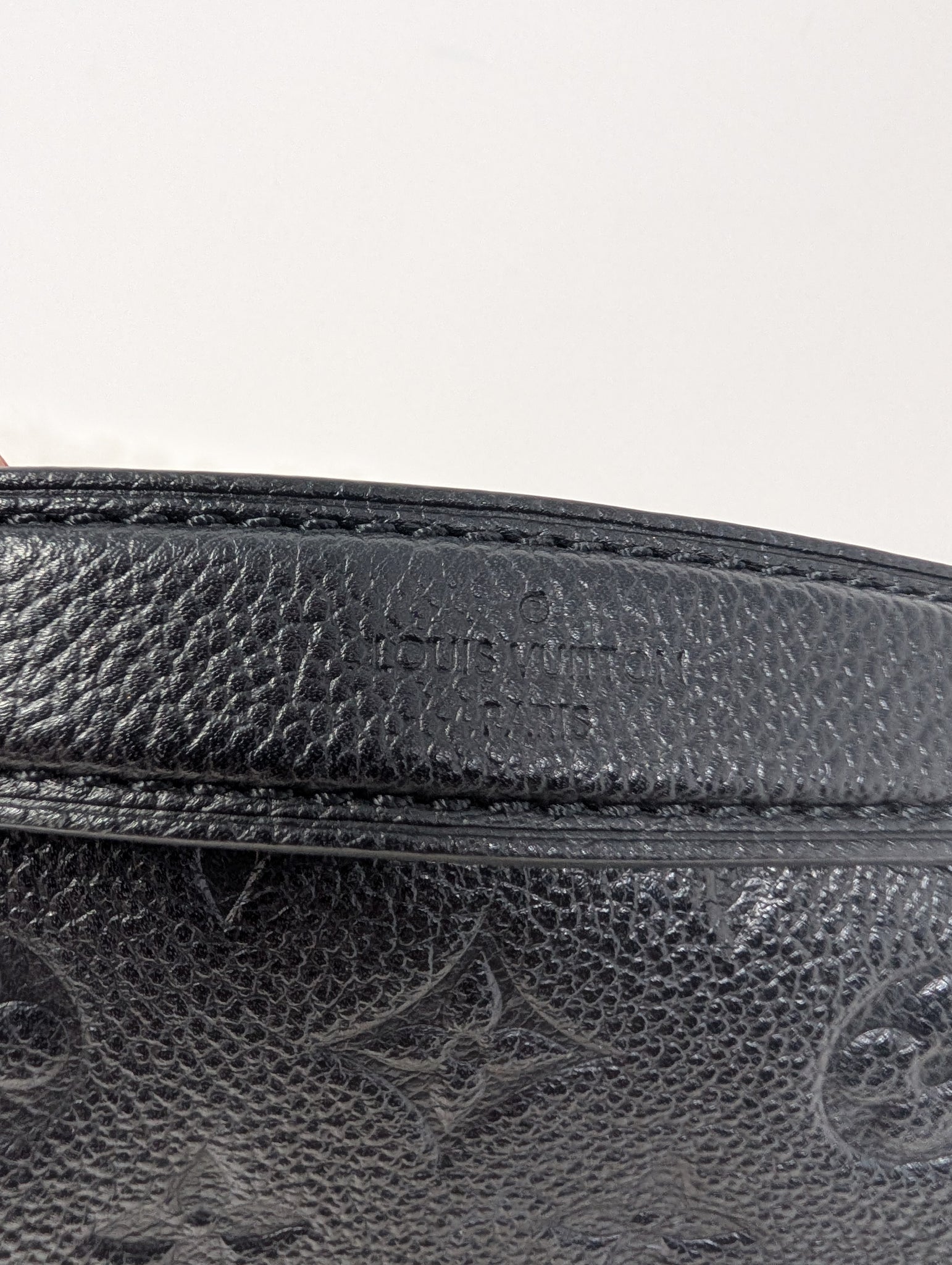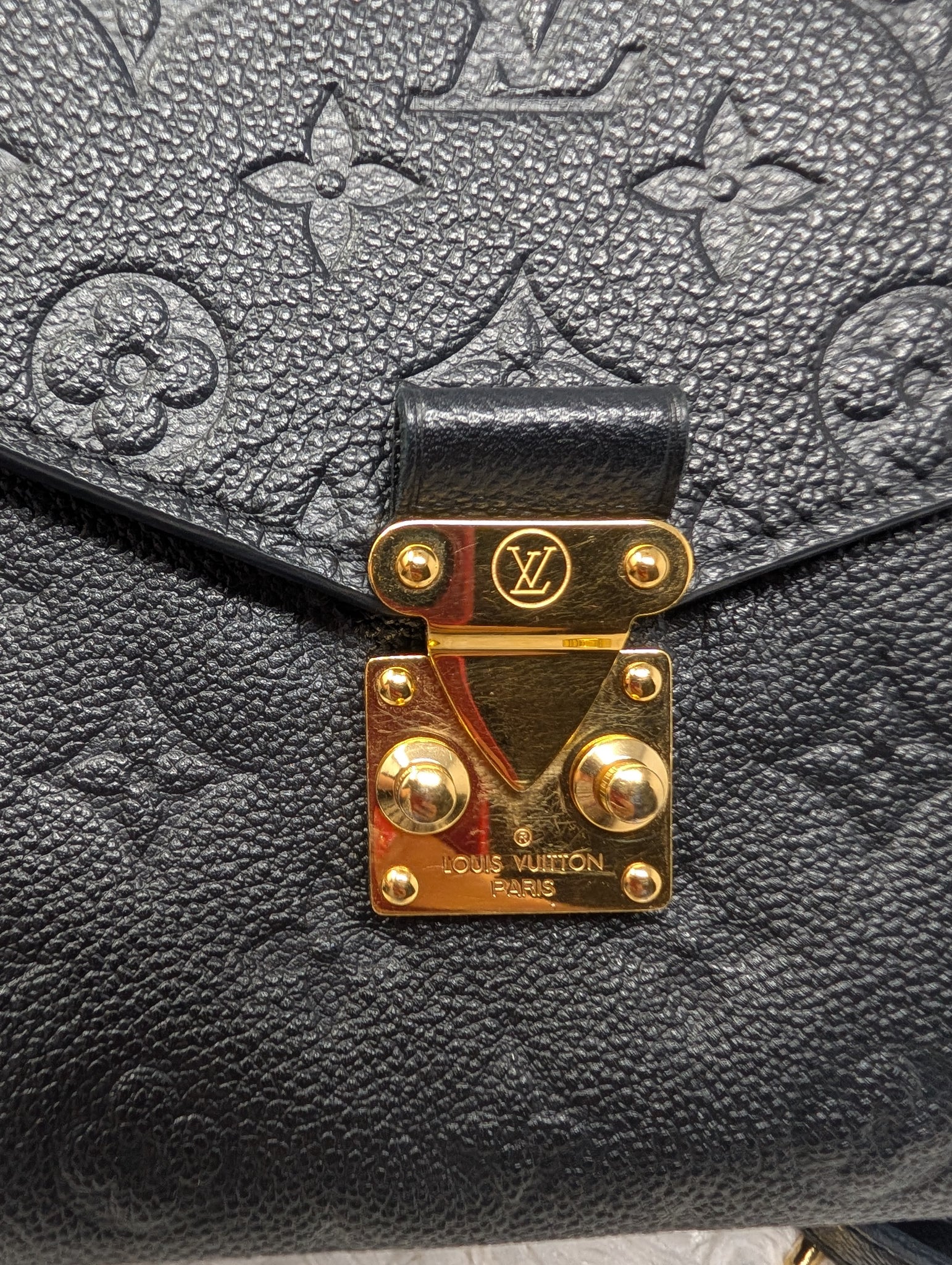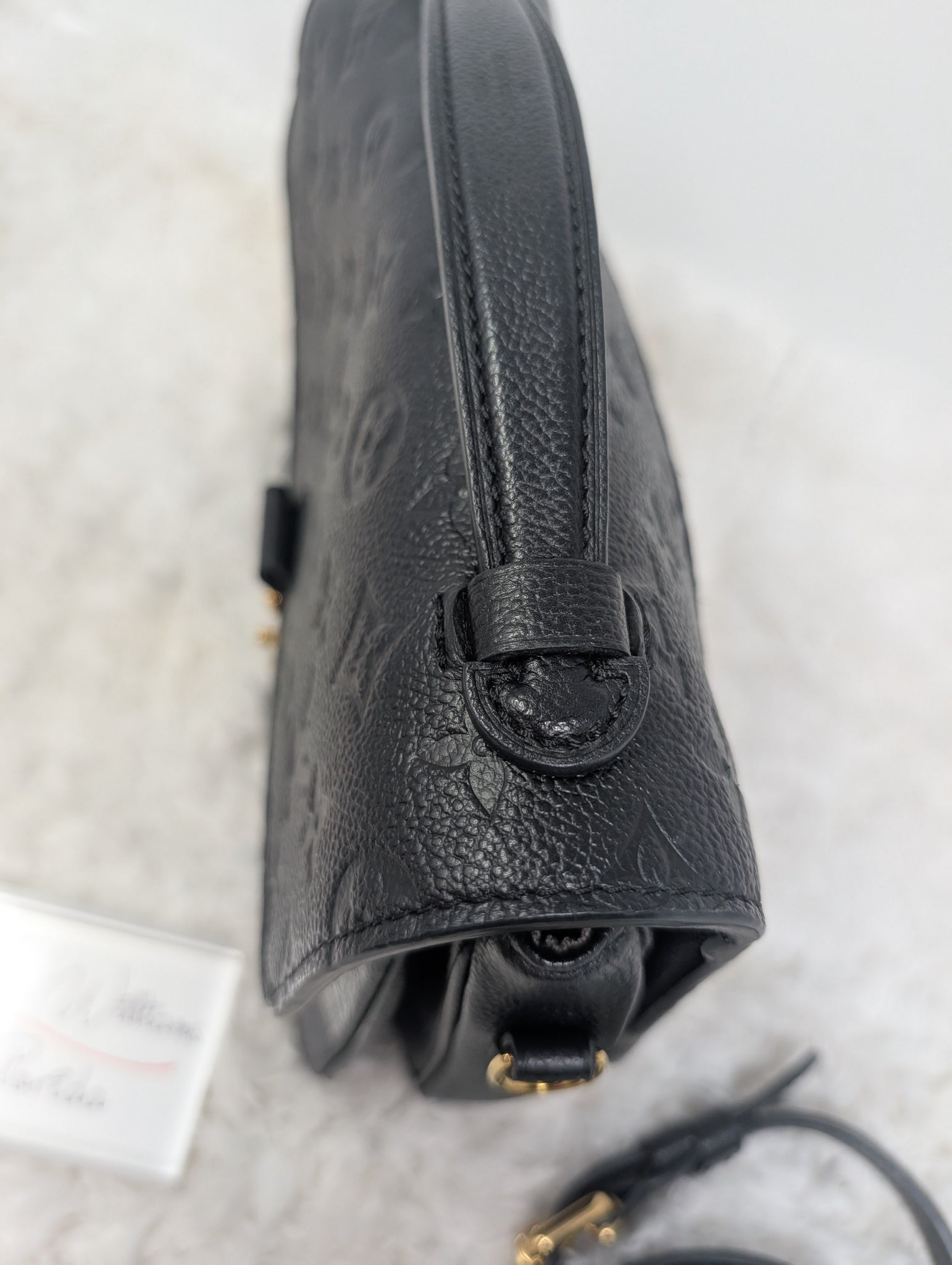 In deep embossed black empreinte leather with gold hardware.... She is in excellent condition.