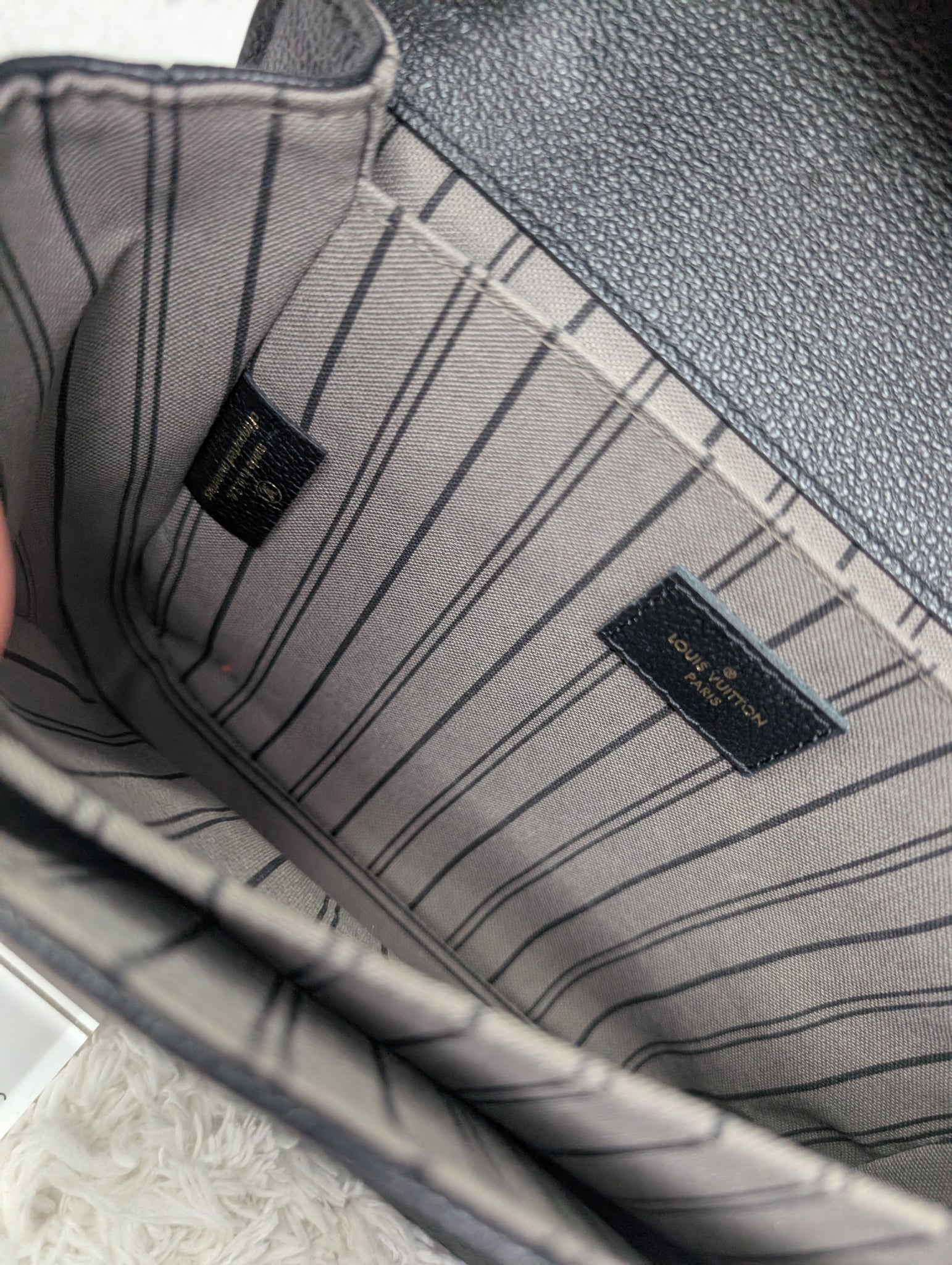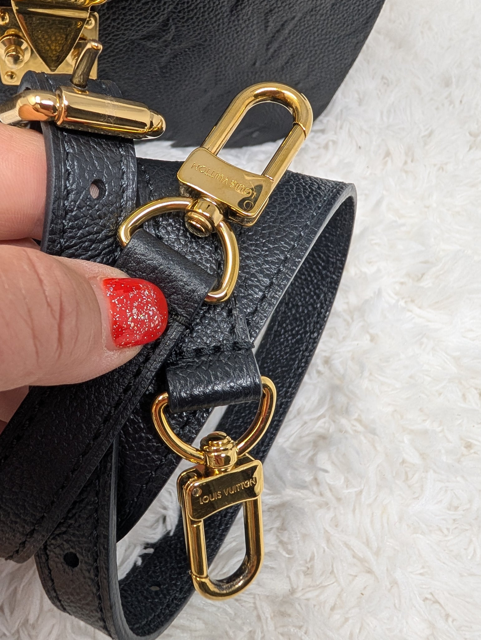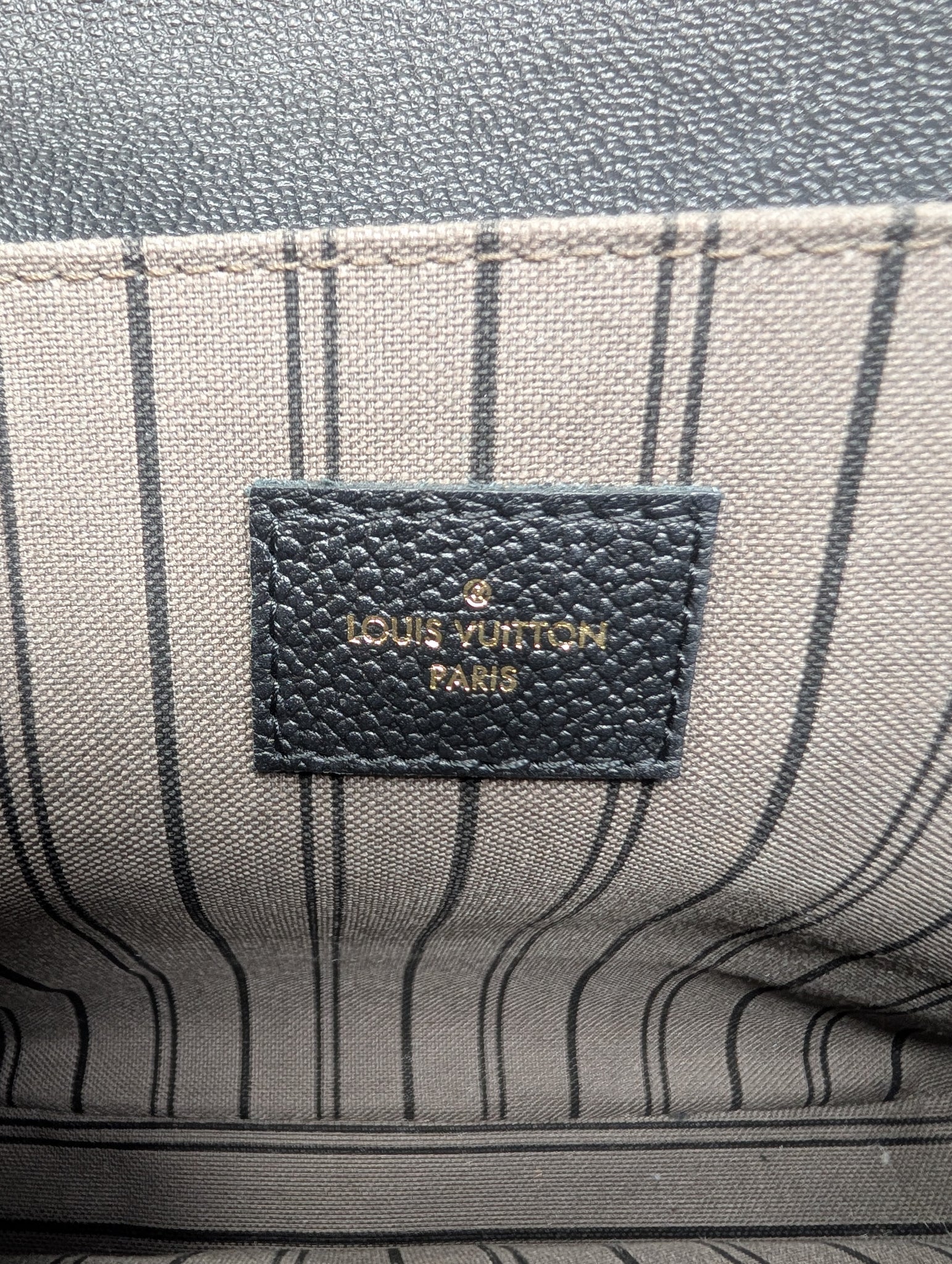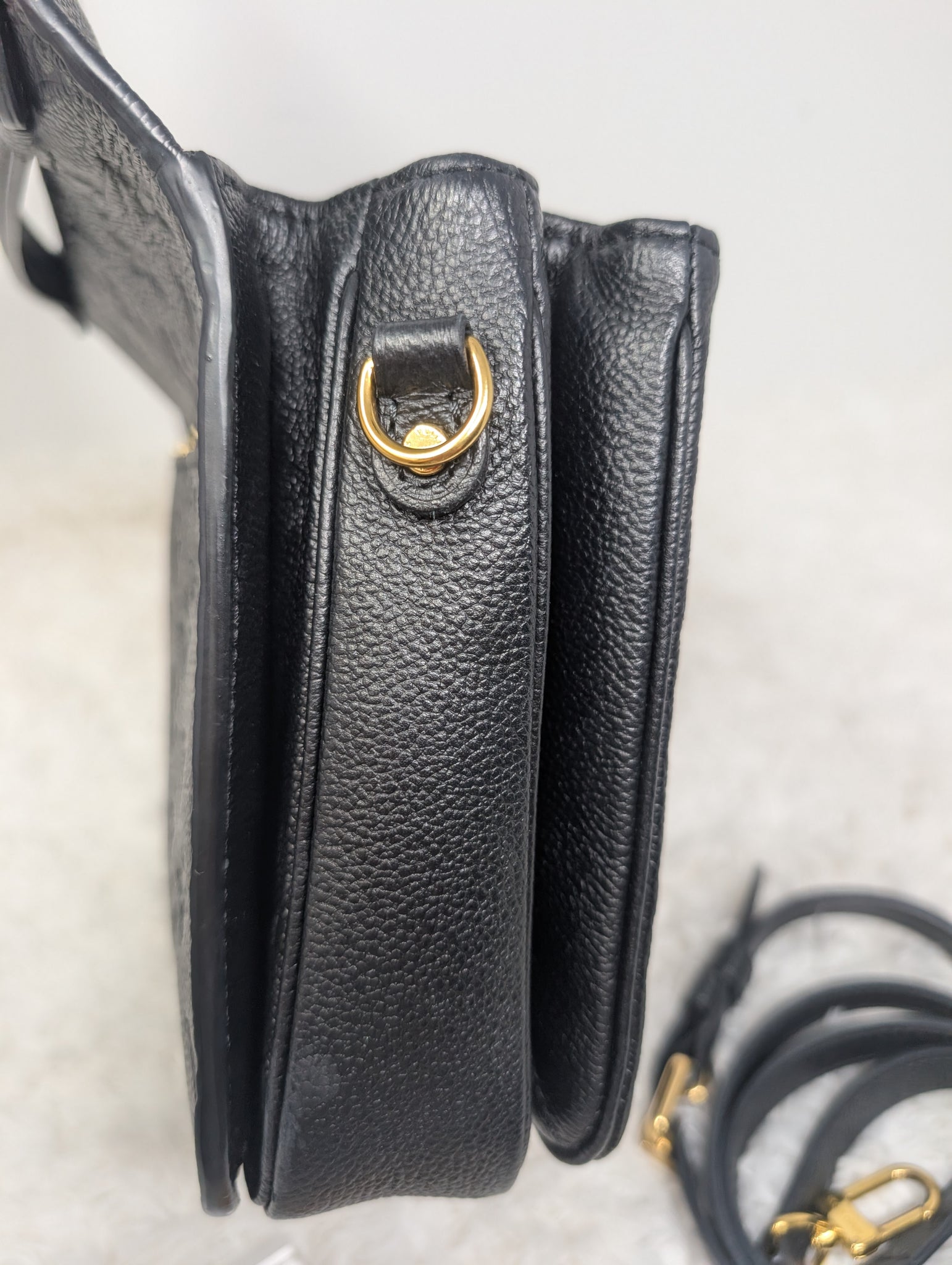 In deep embossed black empreinte leather with gold hardware.... She is in excellent condition.