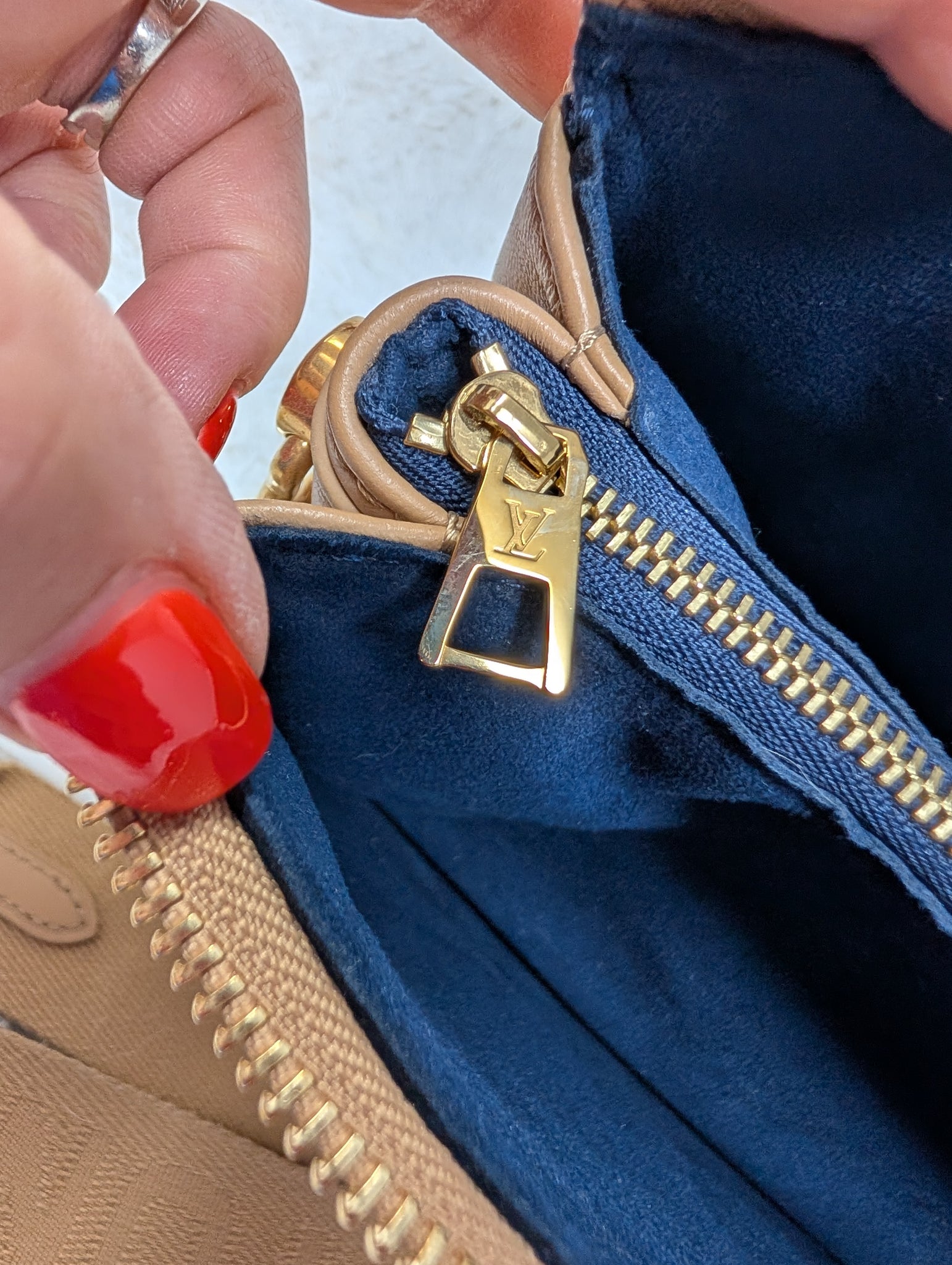 Interior is immaculate in a lovely blue microfiber lining. Three separate compartments, with center zipping closed, and full top closure zipper.