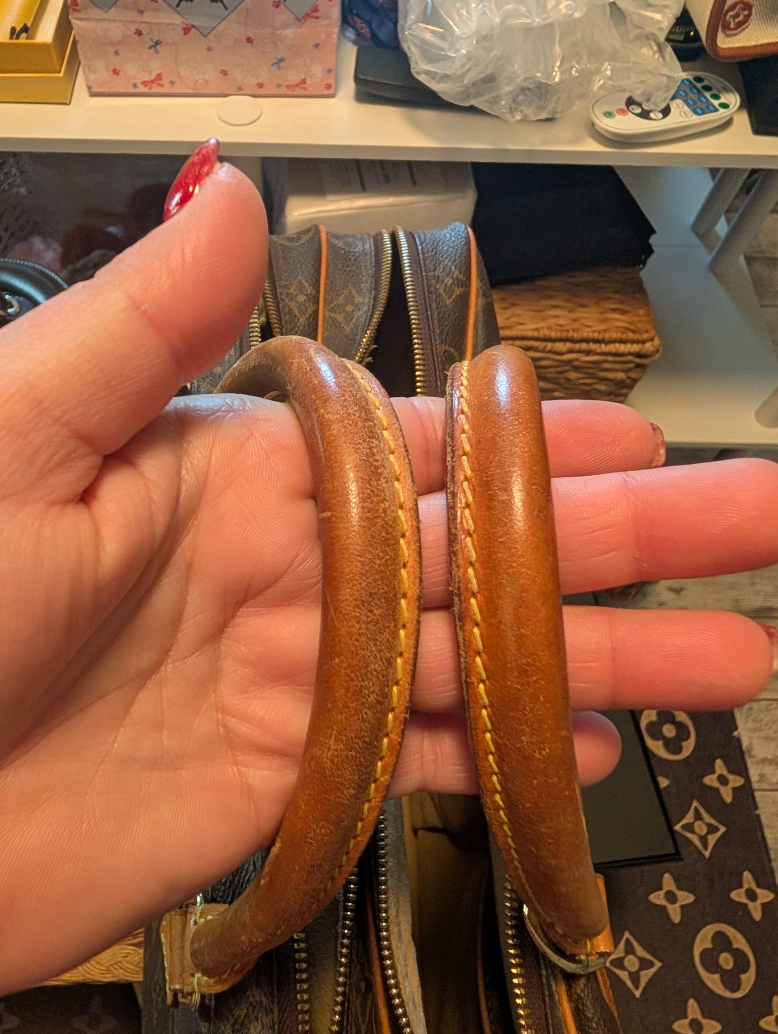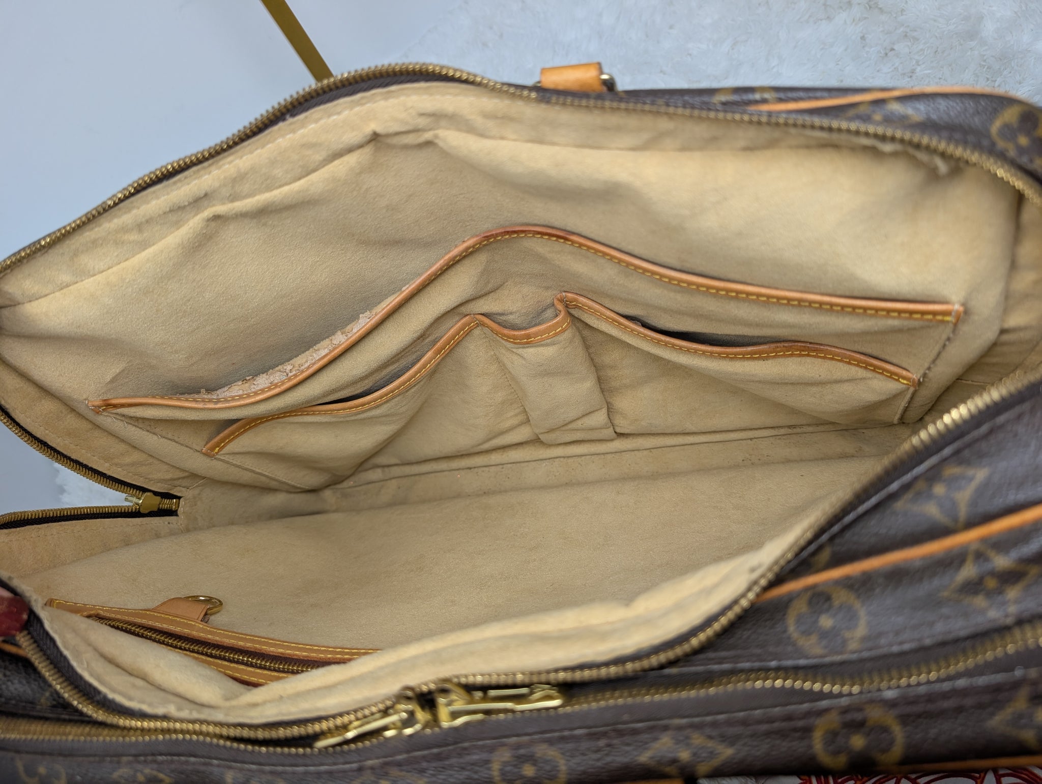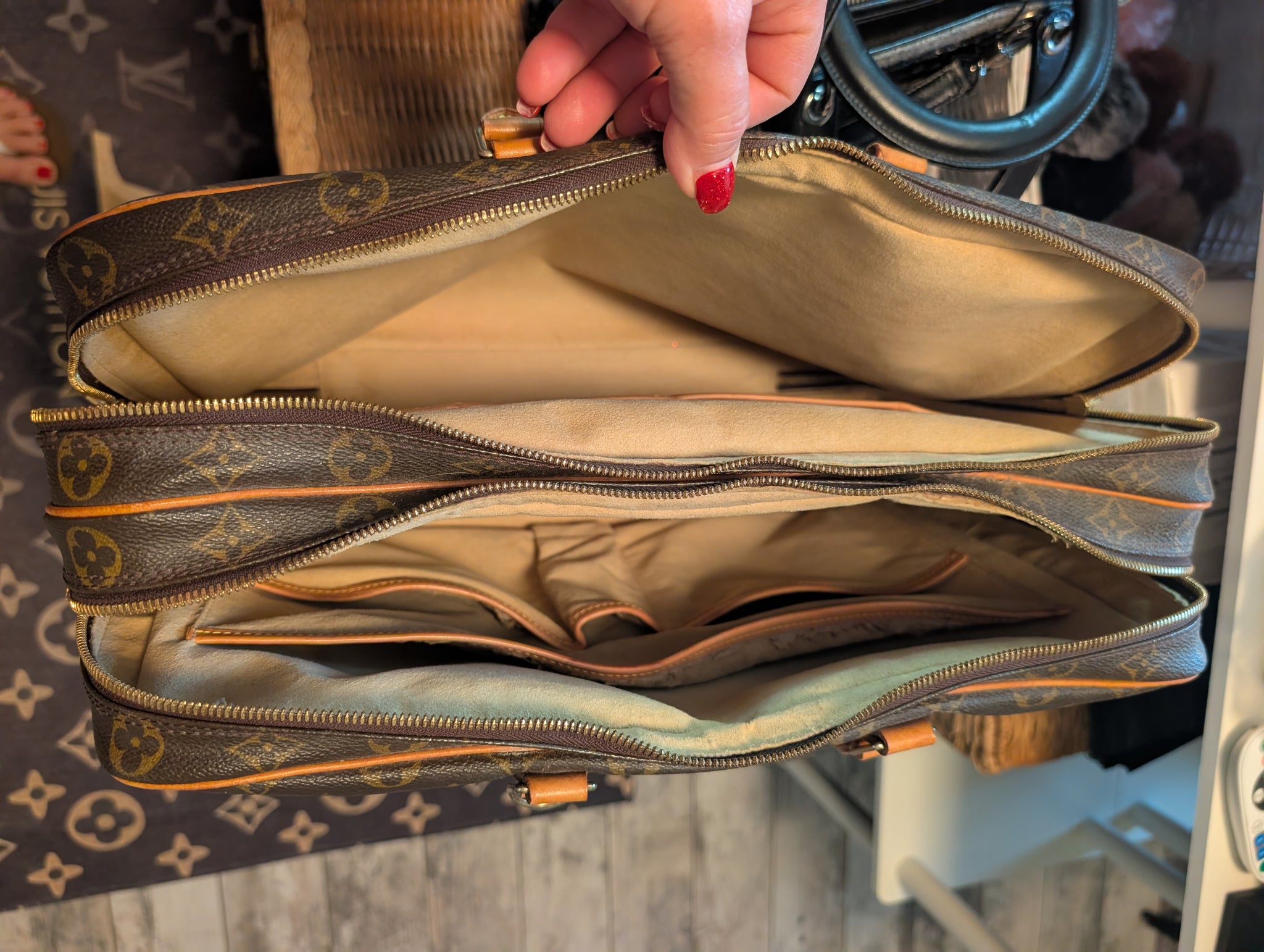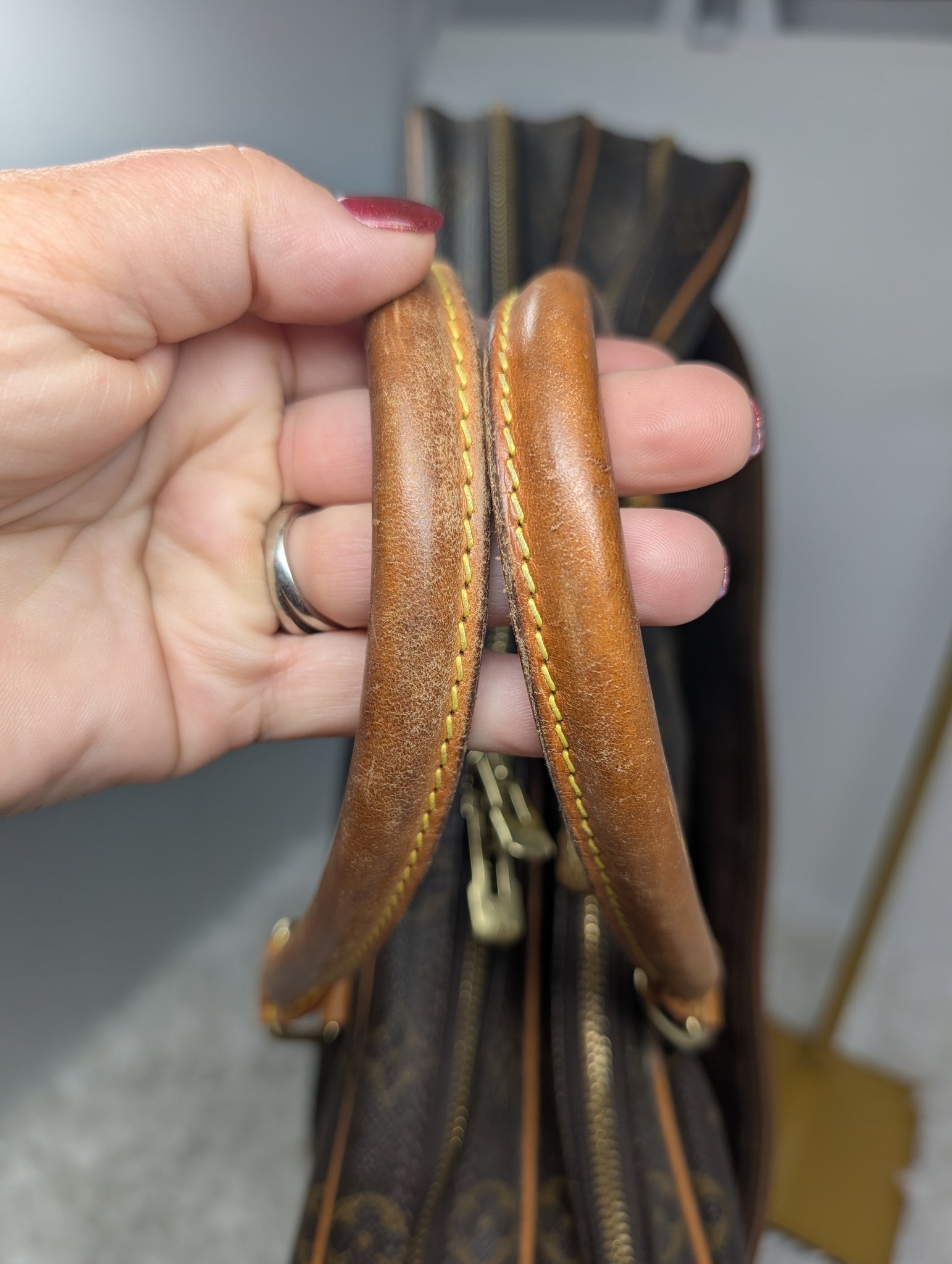 Exterior does show some signs of use, darker vachetta, some rubs, but overall briefcase remains in very good condition. If you had the patience to remove the sticky parts of the pockets, the pockets would become usable again. I never bothered I just didn't use those pockets when I carried the briefcase. There are many YouTube videos on how to clean out sticky pockets just FYI.